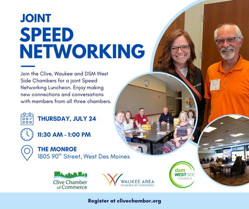Join us for a thrilling afternoon of business networking as the Clive, DSM West Side, and Waukee Area Chambers of Commerce come together for a partnered speed networking luncheon.